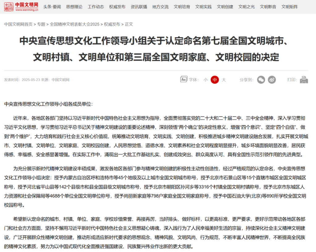 荣誉时刻 | Z6·尊龙凯时[中国]官方网站 荣获第七届“全国文明单位”称号